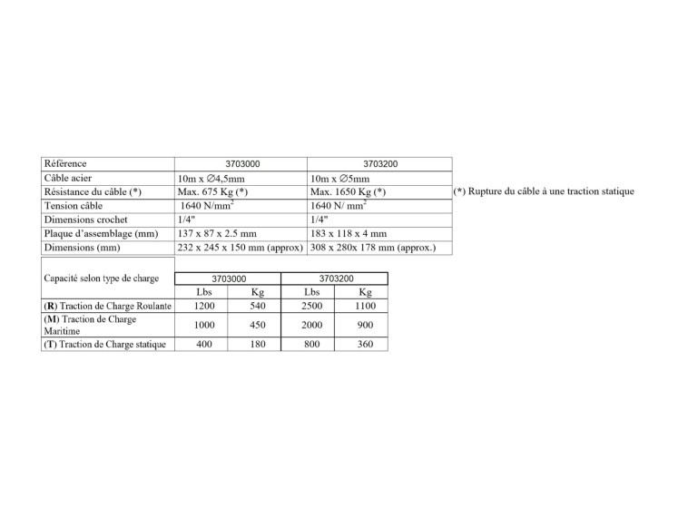 | - | 3703200 | 1100 kg | 183x118x4 mm | 308x280x178 mm (approx.) | 225 mm | 4.1/1 & 8/1 | câble acier Ø 5 mm x 10 m |